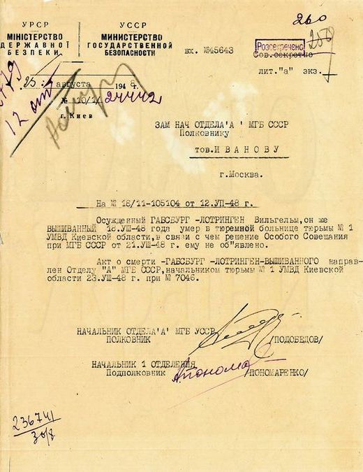 Василь Габсбург був засуджений до 25 років позбавлення волі та направлений до Володимирської тюрми. Однак 18 серпня 1948 року ерцгерцог помер у лікарні Лук’янівської в’язниці від двостороннього кавернозного туберкульозу легенів. Місце поховання Вільгельма Габсбурга досі невідоме. Реабілітований посмертно тільки в 1989-му.